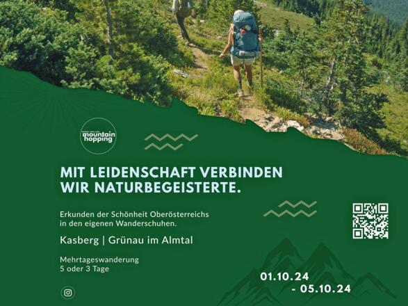 mountain hopping ist ein Weitwanderevent als in Oberösterreich, das Wanderbegeisterte auf eine drei- oder fünftägige Tour durch das malerische Almtal führt. Das Ziel des Events, einem Praxisprojekt des Masterstudiengangs Sport-, Kultur- und Veranstaltungsmanagement der FH Kufstein Tirol, ist es, Menschen die Schönheit der Natur näherzubringen, sie zu ermutigen, persönliche Grenzen zu überwinden und Gemeinschaft zu fördern. Die Teilnehmer:innen können zwischen einer anspruchsvolleren fünftägigen Tour, die am 1. Oktober 2024 beginnt, und zwei dreitägigen Touren, die am 3. Oktober 2024 starten, wählen.