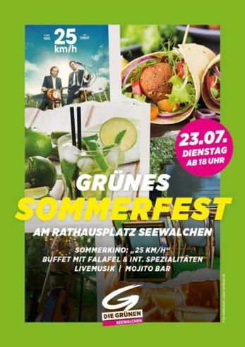 Grünes Sommerfest mit Sommerkino "25 km/h"; Buffet mit Falafel & int. Spezialitäten; Livemusik und Mojito Bar