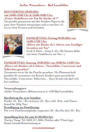 Kinder 40,- Eur / Erwachsene: 60,- Eur (inkl. Roh- und Glasurbrand für 500g Ton)