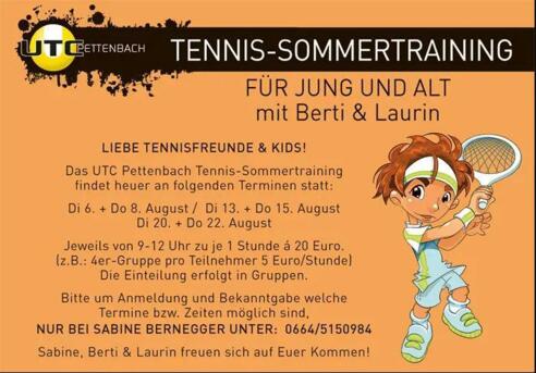 Das UTC Pettenbach Tennis - Sommertraining findet heuer an folgenden Terminen statt: DI 6.8 + DO 8.8 / DI 13.8 + DO 15.8/ DI 20.8 + DO 21.8