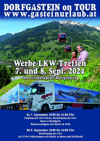 Am Wochenende vom 7.9.2024 - 8.9.2024 findet in Dorfgastein an der Talstation Gipfelbahn Fulseck das Werbe-LKW-Treffen statt.