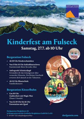 Wir laden Sie herzlich ein zum Kinderfest am Fulseck. Während um 10:00 Uhr am Fulseck das Kinderschminken beginnt, findet bei der Kieserl Bergstation eine Zaubershow mit Magic Max statt. Danach habt Ihr genug Zeit, um ein Foto bei der Fotostation zu machen und zum Fulseck zurück zu wandern, um die faszinierende Seifenblasenshow um 13:00 Uhr anzusehen. Ab 14:00 Uhr spielt Bluatschink ein Familienkonzert.