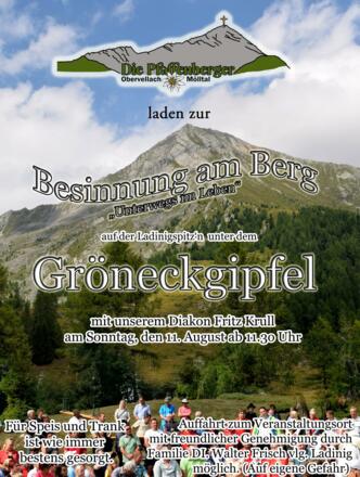Einladung zum Besuch bei der "Besinnung am Berg" auf der Ladinigspitz'n unter dem Gröneckgipfel am Sonntag, den 11. August 2024 um 11:30 Uhr.