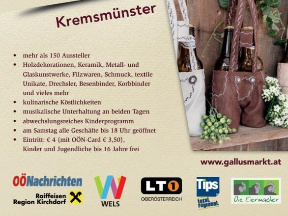 Kremsmünster ist regional bekannt als Marktgemeinde und dies seit bereits seit 1489. Nun soll ein alter Markt zu Ehren des Hl. Gallus wieder aufgelebt lassen werden. Der Hl. Gallus hat am 16. Oktober Namenstag. Und bereits seit 1827 gibt es in Kremsmünster einen Gallusmarkt.