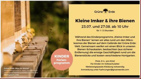 Währed des Kinderprogramms "Kleine Imker und ihre Bienen" lernen wir alles rund um den Mikrokosmos der Bienen auf dem Gelände der Grüne Erde-Welt. Gemeinsam werfen wir einen Blick in unseren Bienen-Schaukasten, beobachten (aus sicherer Entfernung) die emsige Geschäftigkeit rund um die Bienenstöcke und kosten verschiedene Honiggarten.