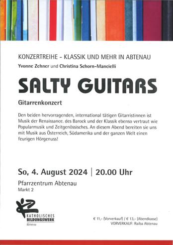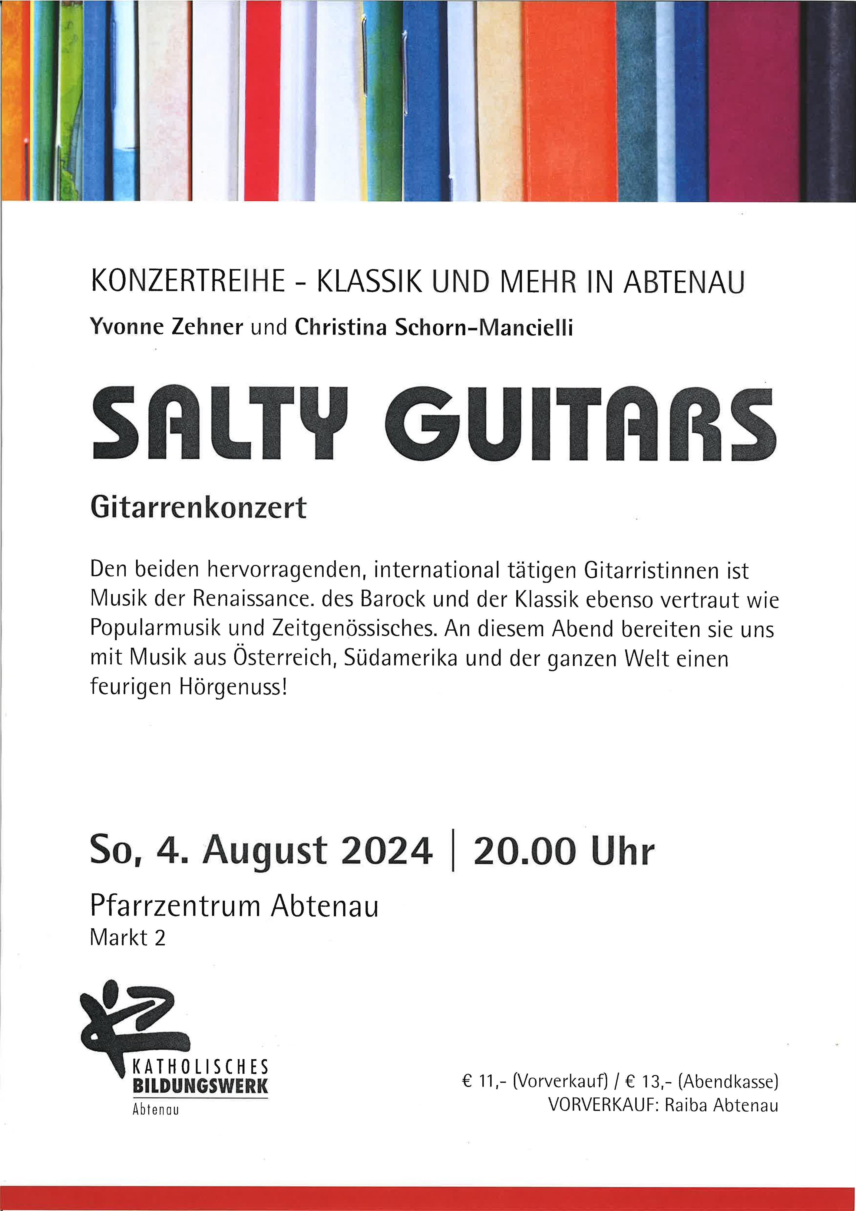 Yvonne Zezner und Christina Schorn-Mancielli - Den beiden hervorragenden, international tätigen Gitaristinnen ist Musik der Renaissance, des Barock und der Klassik ebenso vertraut wie Popularmusik und Zeitgenössisches. An diesem Abend bereiten sie uns mit Musik aus Österreich, Südamerika und der ganzen Welt einen feurigen Hörgenuss!