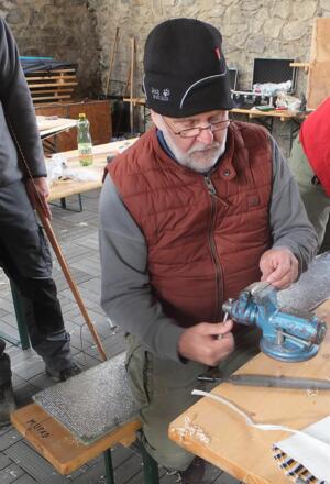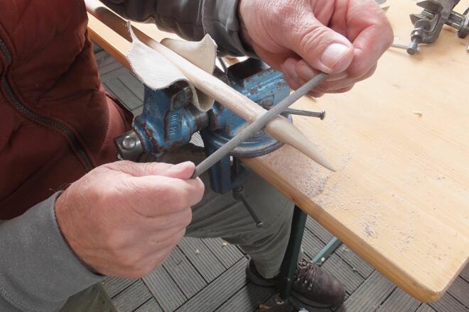 In muskelzehrender Arbeit drehen wir Sehnen, fertigen Pfeile und feilen Spitzen aus Geweih. Die Mühen lohnen sich: nach diesem intensiven Workshopwochenende feuern wir mit unseren fertiggestellten Bögen einen Pfeil ab.