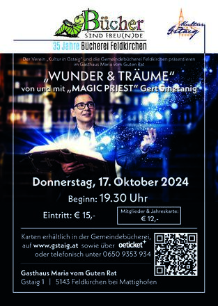 Der magische Abend mit Magic Priest Gert Smetanig findet im Festsaal des Gasthauses Maria vom Guten Rat in Gstaig statt, Beginn ist um 19:30 Uhr. Für Besitzer einer Jahreskarte der Öffentlichen Gemeindebücherei Feldkirchen gibt es ermäßigte Eintrittskarten um € 12,-, der reguläre Ticketpreis beträgt € 15,-. Karten sind in der Gemeindebücherei während der Öffnungszeiten (Montag und Donnerstag jeweils 15:30 – 17:00 Uhr), im Online-Ticketshop auf www.gstaig.at sowie telefonisch unter 0650 9353 934 erhältlich.