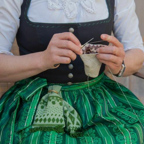Ein Beispiel zum Schmunzeln unterstreicht vielleicht am besten, wie viel lustvolles Experimentieren und welcher Ehrgeiz für Hedwig Huber dabei eine Rolle spielen. Sie versteht sich nämlich auf die Kunst des Strickens von „Sauduttenmuster-Strümpfen“. Und das kam so: die Innviertler Musikkapelle von Pramet ist einheitlich gekleidet und mit besonders auffälligen Stutzen ausgestattet. Die Anleitung für das Muster zur Herstellung der exklusiven Kniestrümpfe wurde allerdings geheim gehalten. Da erinnerte sich Hedwig an alte Handarbeitsstücke ihrer Mutter, die diesem Noppenmuster entsprachen. Sie nahm sie sich vor, lüftete das Geheimnis und heute trägt sie selbst diese prachtvollen Strümpfe zum Dirndl.