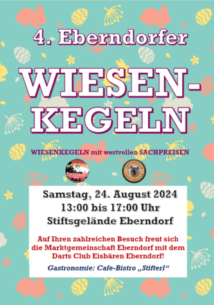 In den Vorjahren traditionell am Ostermontag, wird das von der Marktgemeinschaft Eberndorf mit Unterstützung des ASKÖ DC (Darts Club) Eisbären alljährlich in Eberndorf veranstaltete Wiesenkegeln heuer am Samstag, dem 24. August, stattfinden. Austragungsort dieser beliebten Freiluftveranstaltung ist wiederum das Stiftsareal, ihre Geschicklichkeit beim Kegeln können die Teilnehmerinnen und Teilnehmer in der Zeit von 13:00 bis 17:00 Uhr unter Beweis stellen.