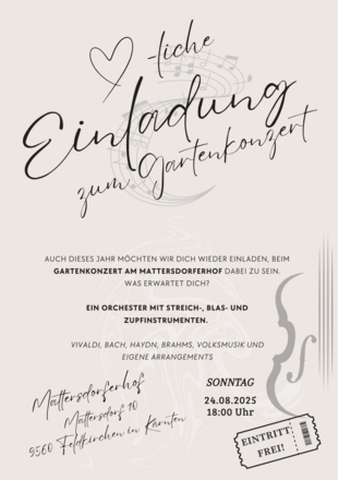 Auch dieses Jahr möchten wir dich wieder einladen, beim Gartenkonzert am Mattersdorferhof dabei zu sein.