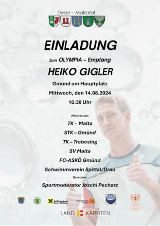 Einladung zum Olympia-Empfang von Heiko Gigler am MI, 14.8.2024 um 16.30 Uhr, Hauptplatz Gmünd