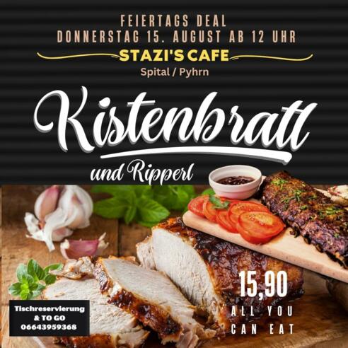 All you can eat - Kistenbratl und Ripperl in Stazi`s Cafe. Ab 12 Uhr, auch zum Mitnehmen. Um Reserveirung wird gebeten.