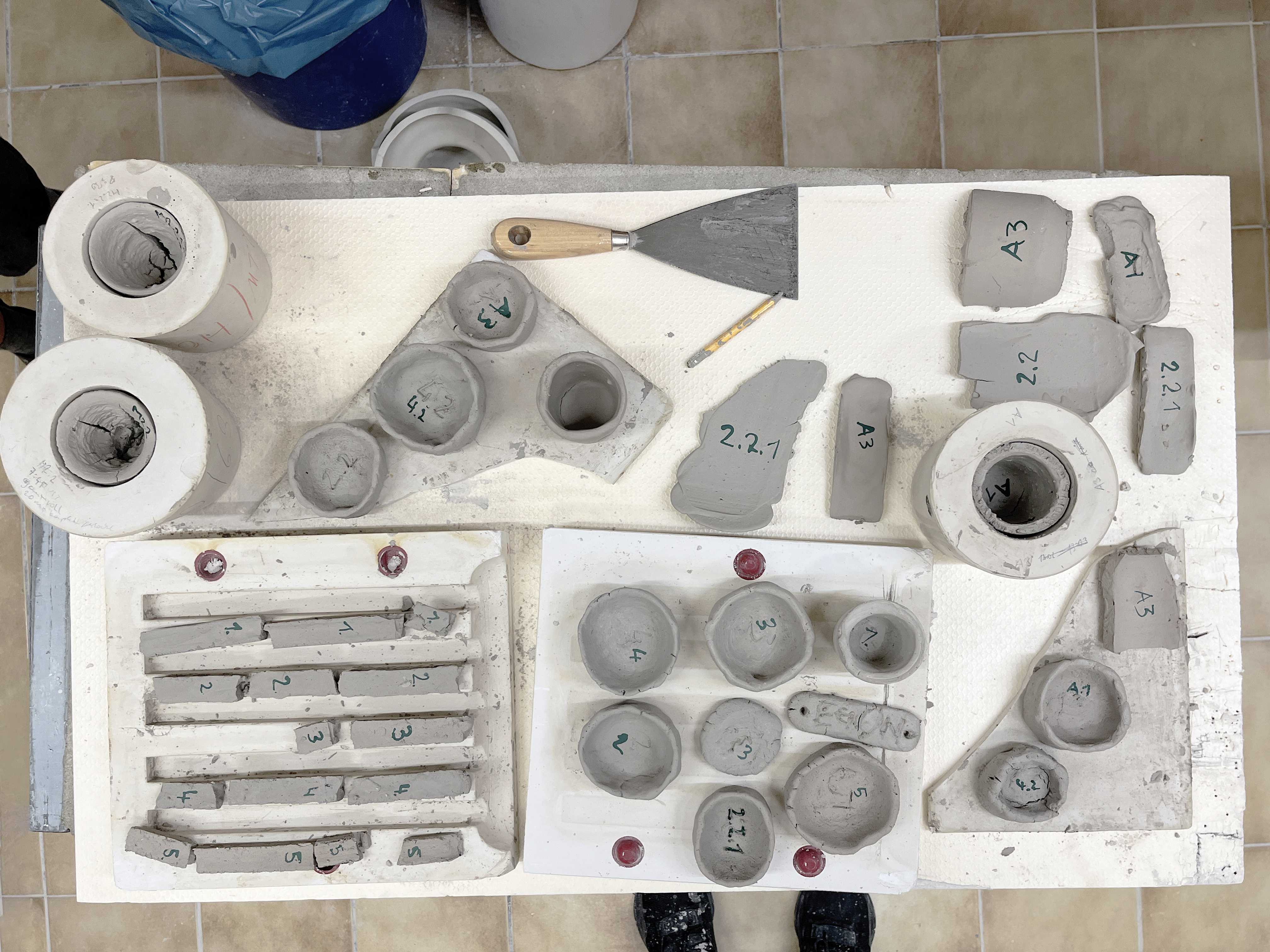 Abfallströme der Filterkuchen, der als Nebenprodukt der Wasserwirtschaft anfällt. Dieser „Kuchen“ besteht aus verschiedenen Stoffen, die aus dem Wassersystem herausgefiltert werden, vor allem aus Keramik- und Porzellanresten, und ist daher trotz seiner schwankenden Zusammensetzung eine wertvolle Ressource. Außerdem sammelt das Staubfiltersystem der Fabrik Glasurstaub und allgemeinen Staub. Die in der Fabrik durchgeführten Interviews und eine Überprüfung früherer Ideen machten deutlich, dass ein Materialverfahren benötigt wurde, das sich nahtlos in die bestehenden Produktionskapazitäten integrieren ließ. Erste Versuche, den unbehandelten Filterkuchen zu brennen, zeigten, dass das Material nach dem Brennen zwar stabil ist, aber aufgrund seiner bröckeligen und starren Beschaffenheit eine Herausforderung darstellt.