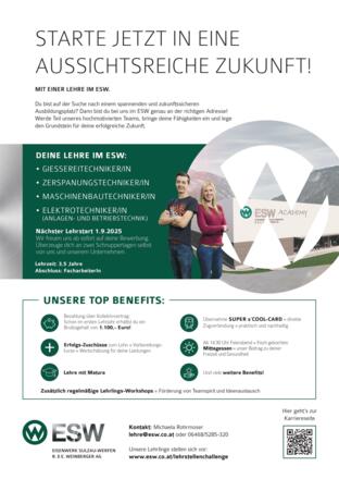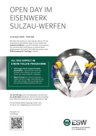 Wir laden Sie ein, beim Tag der offenen Tür des Eisenwerks Sulzau-Werfen dabei zu sein! Erleben Sie exklusive Einblicke in unsere Produktion und entdecken Sie, wie Innovation und Präzision in unserem Werk gelebt werden. Auch gilt es die Eröffnung unserer neuen ESW Academy für Lehrlinge zu feiern!