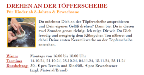 | Preisinformation | Kursbeitrag: 30,- € pro Termin und Kind/50,- € pro Erwachsener (zzgl. Material/Brand) |