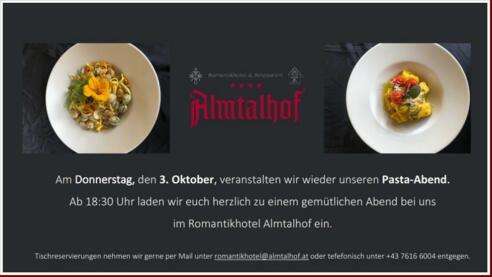 Herzliche Einladung zum Pasta Abend im Romantikhotel Almtalhof.