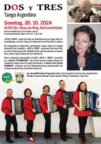 Dieses einzigartige Lebensgefühl vermittelt "DOS y TRES" unterstützt von "Andrea Stumbauer", die mit ihrer warmen, samtigen Stimme von Liebesleid zu singen weiß. Die Tango-Tanzexperten "Tamara und Stefan Krinner" verkörpern mit ihrer Bühnenperformance gewissermaßen den vertikalen Ausdruck einer horizontalen Sehnsucht.