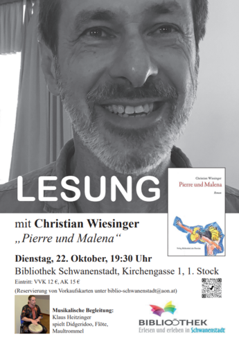 Schwanenstadt. In der „Österreich liest“-Woche der Bibliotheken gastiert der Innviertler Autor Christian Wiesinger in der Öffentlichen Bücherei Schwanenstadt. Am Dienstag, 22. Oktober, liest er ab 19.30 Uhr in der Bibliothek in der Kirchengasse aus seinem Liebesroman „Pierre und Malena“. Darin erzählt er die bewegende Geschichte des Findelkindes Pierre und des Zirkuskindes Malena. Musikalisch begleitet wird der Autor von Klaus Heitzinger (Didgeridoo, Flöte, Maultrommel).
