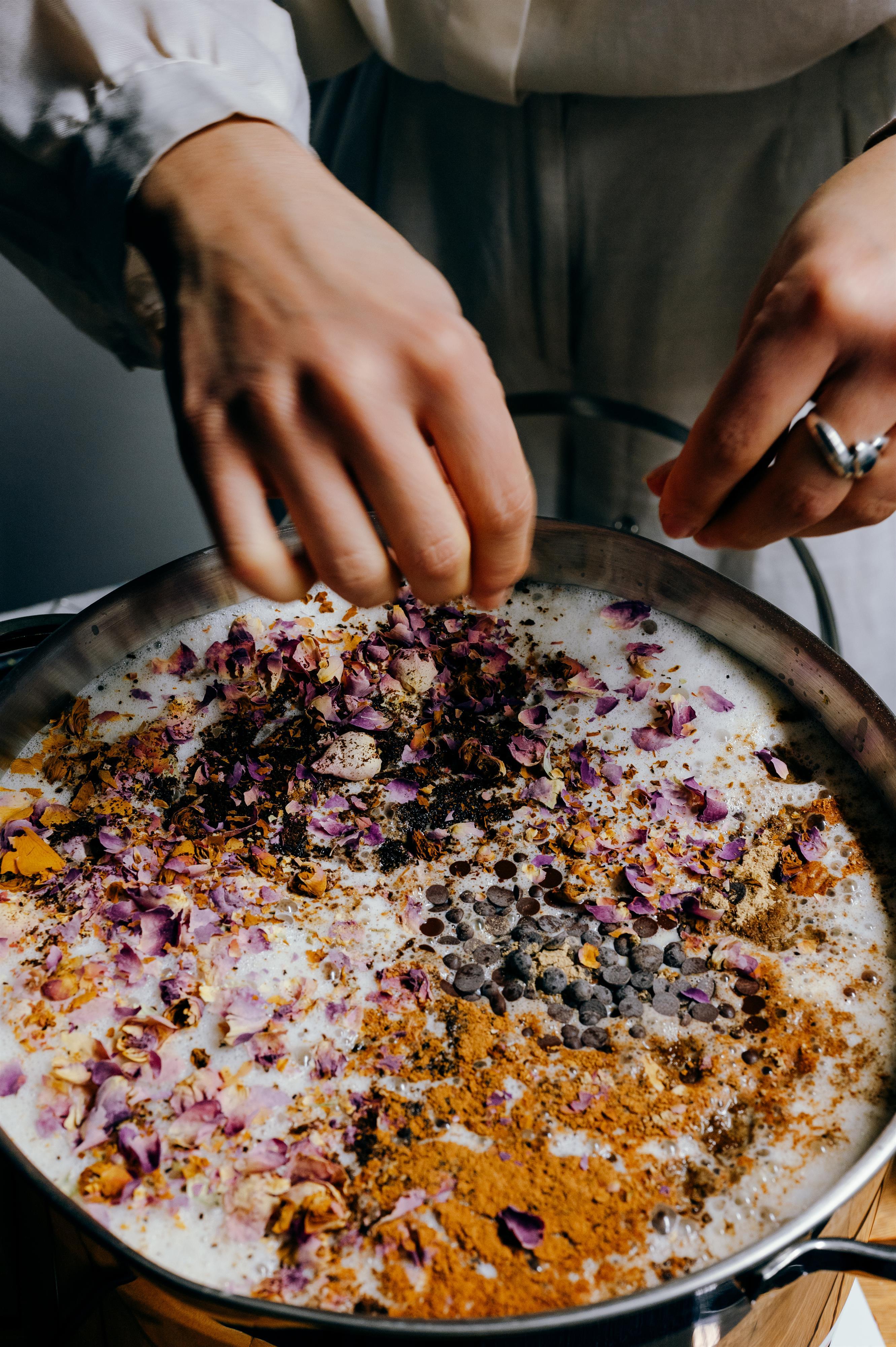 Der Rohkakao in der Zeremonie wird mit Hafermilch zubereitet und mit Gewürzen verfeinert. Ihm wird ein aktivierender und stimmungsaufhellender Effekt nachgesagt. Roh bedeutet in diesem Fall, dass die Kakaobohnen nicht geröstet werden und somit ein Großteil ihrer wertvollen Wirkstoffe erhalten bleibt.