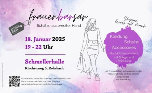 "frauenBARsar" am 18. Januar 2025 in Rohrbach/ Ilm: Gut sortierter Frauenbasar für Mode, Accessoires, Schuhe und Sportequipment. Spiegel und Sammelumkleiden vorhanden. Finde Deine Schätze aus zweiter Hand.