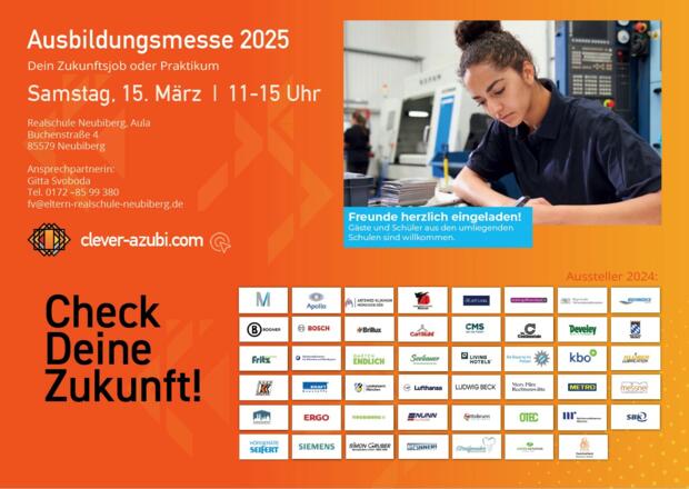 Welcher Beruf ist für mich richtig? Wie bewerbe ich mich? Antworten erhalten Schüler und ihre Eltern bei der inzwischen achten Ausbildungsmesse in der Realschule Neubiberg am 15. März 2025. Von 11 bis 15 Uhr informieren rund 50 namhafte Unternehmen aus der Region über Berufsbilder, Ausbildungsmöglichkeiten und Praktika. Diese Ausbildungsmesse richtet sich speziell an Schüler der 8. bis 10. Klassen aller Schulen des Landkreises. Nähere Infos unter www.clever-azubi.com.