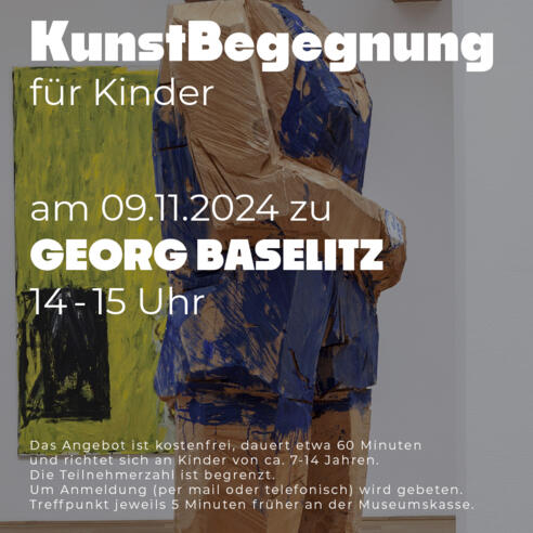 Diesmal steht der deutsche Künstler Georg Baselitz und seine verrückten Kunstwerke im Mittelpunkt. Gemeinsam mit einer Museumsmitarbeiterin gehen die Kinder der Frage nach, warum seine Welt auf dem Kopf steht und staunen aus wie vielen Farben ein Gesicht bestehen kann. Außerdem lernen wir die riesenhafte „Frau Ultramarin“ näher kennen und versuchen herauszufinden was sie uns sagen möchte.