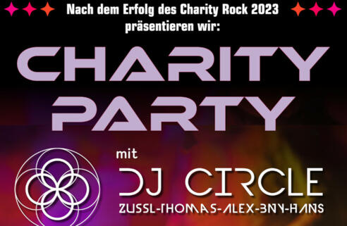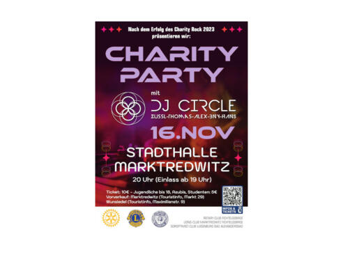 Nach dem Erfolg des Charity Rock 2023 präsentieren wir:CHARITY PARTY mit DJ CIRCLEZussl-Thomas-Alex-BNY-HansVeranstalter: Rotary-Club FichtelgebirgeLions-Club Marktredwitz FichtelgebirgeSoroptimist-Club Luisenburg Bad Alexandersbad