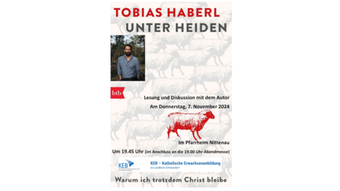 Vor anderthalb Jahren schrieb der Münchner Journalist Tobias Haberl (49) im Magazin der "Süddeutschen Zeitung" einen Essay mit dem Titel "Unter Heiden". Die Resonanz war so überwältigend, dass er ein Buch daraus gemacht hat.Am Donnerstag 7. November kommt er nach Nittenau, um Auszüge aus seinem Buch vorzulesen und dann mit Pfr. Holger Kruschina ins Gespräch über den Glauben zu kommen. Die Veranstaltung schließt sich an die Donnerstagabendmesse (19.00 Uhr) an und beginnt um ca. 19.45 Uhr im Pfarrheim. Der Eintritt ist frei, um einen freiwilligen Obulus wird gebeten. Der Abend findet in Kooperation mit der KEB Schwandorf statt.Tobias Haberl, geboren 1975 in Roding, hat in Würzburg und Großbritannien Germanistik und Anglistik studiert. Seit 2005 arbeitet er für das SZ Magazin. Er lebt in München.