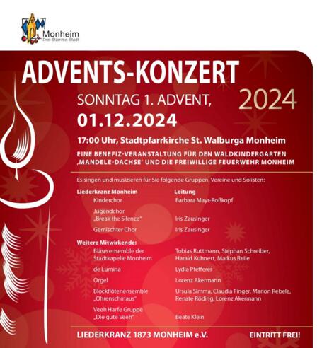 Traditionelles Adventskonzert in der Stadtpfarrkirche St. Walburga in Monheimam 1. Adventssonntag - organisiert vom Liederkranz Monheim.Am Konzert beteiligen sich ausschließlich lokale Vokal- und Instrumentalgruppen.Der Eintritt ist frei - Spenden für regionale, soziale Projekte werden gerne entgegengenommen.Herzlichen Dank sagt der Liederkranz 1873 Monheim e.V.