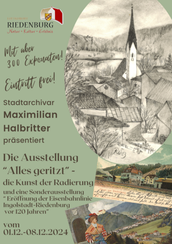Zur Advents- & Weihnachtszeit präsentiert die Stadt Riedenburg die Ausstellung "Alles geritzt” - die Kunst der Radierung sowie eine Sonderausstellung zur “Eröffnung der Eisenbahnlinie Ingolstadt-Riedenburg vor 120 Jahren." Im Gedenken an die vor 10 Jahren verstorbenen Olga Koulikova und Cornelius Richter, werden in der Ausstellung einige Werke der beiden unvergessenen Riedenburger Künstler im Haus des Gastes, 1. OG zu sehen sein.Es werden über 100 Radierungen von 40 regionalen, nationalen und internationalen Künstlerinnen und Künstlern, sowie über 200 historische Postkarten und Photographien gezeigt. Bereichert wird die Ausstellung zudem wieder durch die "Riedenburger Weihnachtskrippe".Außerdem erhalten Sie während der Ausstellung in einem kleinen Antiquariat "Papierraritäten" mit lokalem Bezug. Der Reinerlös aus dem Bücherverkauf kommt je zur Hälfte den Riedenburger Kindergärten und dem TV Riedenburg für die Jugendförderung zugute.