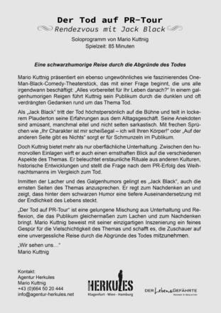 Als Jack Black kommt der Tod auf die Bühne und erzählt über seine im Alltagsgeschäft. Plaudernd teilt er zahlreiche Anekdoten mit seinem Publikum. Er ist amüsant, manchmal eitel und nicht selten sarkastisch. Da und dort blitzen freche Sprüche auf wie zum Beispiel: „Ihr Charakter ist mir scheißegal – ich will Ihren Körper!“ Ganz nebenbei erfährt man auch wie es sich mit dem Wunsch nach einer Himmelbestattung verhält, die derzeit groß im Trend zu sein scheint und wie es kommt, dass sowohl die beeindruckenden Körpermaße umfassende Nachbarin ebenso in eine Urne passt, wie die zierliche Tante Julischka. Neben allen unterhaltsamen Aspekten versteht es Mario Kuttnig aber auch so manchen toten Winkel des Themas ernsthaft zu beleuchten, erzählt von erstaunlichen Ritualen aus anderen Kulturen und stellt die Frage: Warum hat der Weihnachtsmann mehr PR?