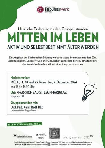 Ein Angebot des Katholischen Bildungswerks für ältere Menschen mit dem Ziel, Selbständigkeit, Lebensfreude und Gesundheit zu fördern bzw. zu erhalten sowie die soziale Verbundenheit mit einer Gruppe zu erleben.
