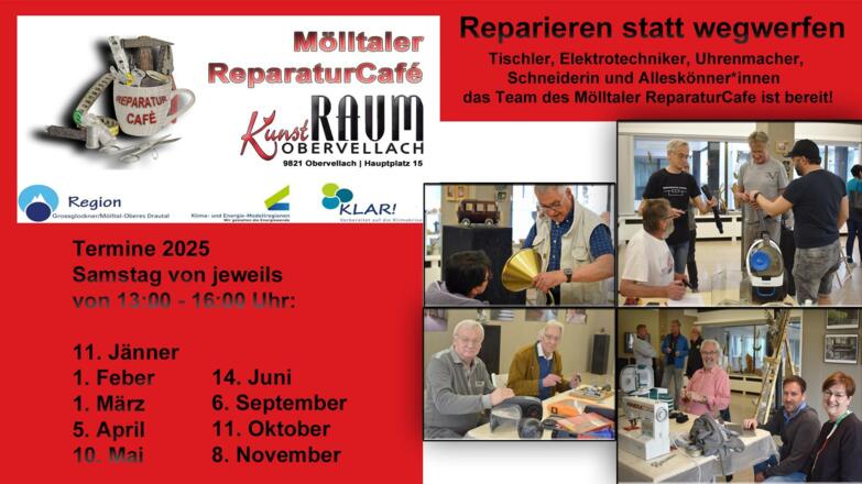 Einmal im Monat an einem Samstag besteht die Gelegenheit im KunstRaum Obervellach von 13:00 Uhr bis 16:00 Uhr kaputt gegangene Gegenstände reparieren zu lassen! Reparieren statt wegwerfen - die Idee ist nicht neu und die Nachfrage nach einem ReparaturCafe ist groß. Beim ReparaturCafe können verschiedene Gegenstände gemeinsam mit ehrenamtlichen Handwerker*innen repariert werden. Es sind oft nur Kleinigkeiten, die zu richten sind. Die Freude bei den Besitzer*innen ist dafür umso größer. Tischler, Elektrotechniker, Uhrenmacher, Schneiderin und Allerkönner*innen – das Team des Mölltaler ReparaturCafe ist bereit!!! Sie helfen bei verschiedenen Problemen mit Rat und Tat. Auch beim Ansuchen des Reparaturbonus wird ältere Menschen geholfen und auch werden sie bei Handy- oder Laptopeinstellungen unterstützt.