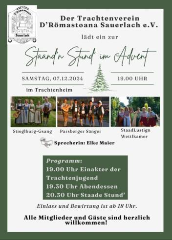 Der Trachtenverein "D´Römastoana" Sauerlach lädt herzlich ein zur öffentlichen Weihnachtsfeier im Trachtenheim am 07. Dezember ab 19:00 Uhr. Das Programm enthält ein Theaterstück der Jugendgruppe, verschiedene Musikgruppen, sowie einer Weihnachtstombola. Der Eintritt ist frei!