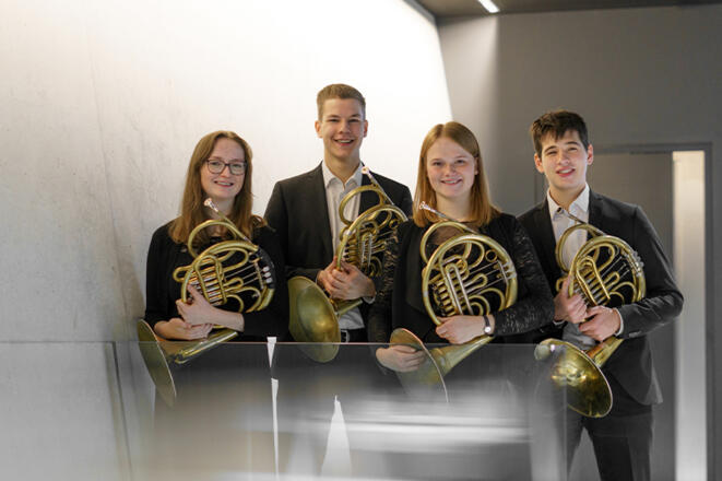 Rund um die Hornistin Katharina Paul formiert sich ein exzellentes Hornquartett mit Daniel Hirsch, Angelika Piffl und Tobias Rössler. Sie studieren in Wien und bringen ein unterhaltsames, pfiffiges Programm mit Werken von Komponisten aus aller Welt. Highlights dabei sind das jazzige Stück „Born for Horn“ von Werner Pirchner und ein maßgeschneidertes Stück von Leonhard Paul.