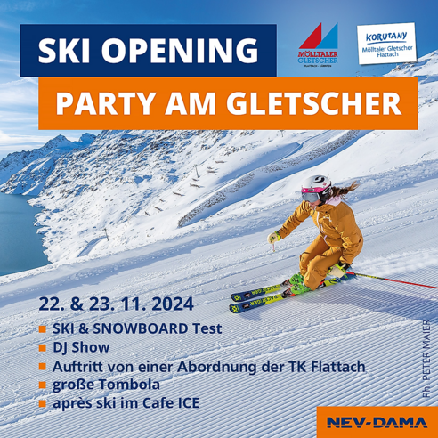 Am 22. und 23. November 2024 findet das „Nev Dama Ski Opening“ am Mölltaler Gletscher statt. Freut euch auf einen Ski & Snowboard Test von Head, Kästle und Sporten sowie auf eine 2-tägige Party mit DJ Marek Toman. Weitere Highlights sind ein Auftritt einer Abordnung der Trachtenkapelle Flattach und eine große Tombola mit tollen Preisen.