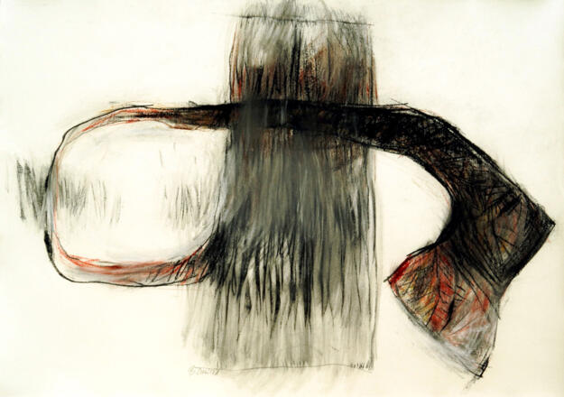 Barbara Schiestl und Thomas Wiederkehr sind Meister ihrer jeweiligen Techniken. Schiestl's Zeichnungen offenbaren dreidimensionale Körperlichkeit, die durch dichte Schattierungen lebendig wird, während Wiederkehr in seinen eigenwilligen Steinobjekten grafische Elemente verwendet und verschiedene Oberflächenstrukturen, von geschliffen bis rau, einsetzt. Diese Kontraste erinnern an Schiestl's subtile, zeichnerische Ausarbeitung der Flächen und verstärken den Dialog zwischen den Werken beider Künstler.