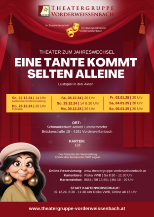 | Preisinformation | Eintrittskarten: Online: www.theatergruppe-vorderweissenbach.atKartenbüro: Raika VWB | Samstag, 8:30 - 11:30 UhrTelefonische Reservierung: 0664 / 58 13 851 | Montag 18 - 20 Uhr Beginn des Kartenverkaufs: 7. Dezember 2024 - die Online-Reservierung wird an diesem Tag um 15:00 Uhr aktiviert. Eintrittspreis: € 12,00 |