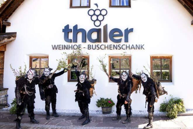 Danach werden die Perchten mit großartigen Masken und teuflisch guten Kostümen beim Weinhof Buschenschank Thaler ihr Unwesen treiben und die Gäste begeistern.
