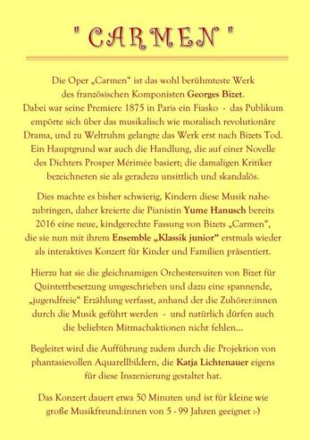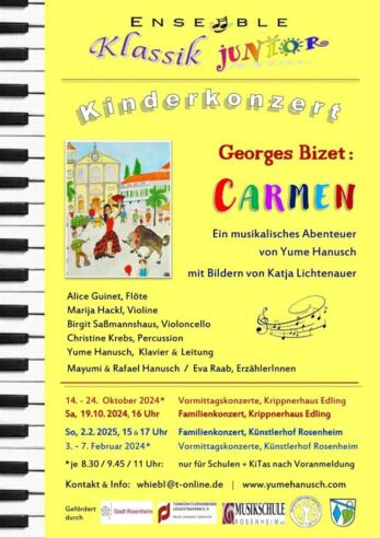 Dies machte es bisher schwierig, Kindern diese Musik nahezubringen, daher kreierte die Pianistin Yume Hanusch eine neue, kindgerechte Fassung von Bizets „Carmen“, die sie nun mit ihrem Ensemble „Klassik junior“ als interaktives Konzert für Kinder und Familien präsentiert.