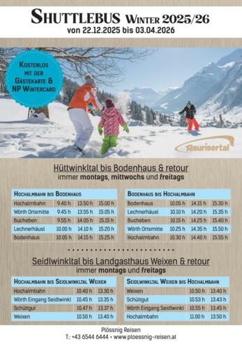 Die Fahrpläne sind im Tourismusbüro erhältlich! Mit der Raurisertal Gästekarte und der Nationalpark Wintercard kostenlos!