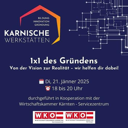 Eine Idee zur Gründung? Möchtest du deine Geschäftsidee zum Leben erwecken? Dann komm zum “1×1 des Gründens”, einer Veranstaltung in Kooperation mit der Wirtschaftskammer Kärnten (Gründerservice). Hier bekommst du die wichtigsten Informationen, die du für den Start ins Unternehmertum benötigst.