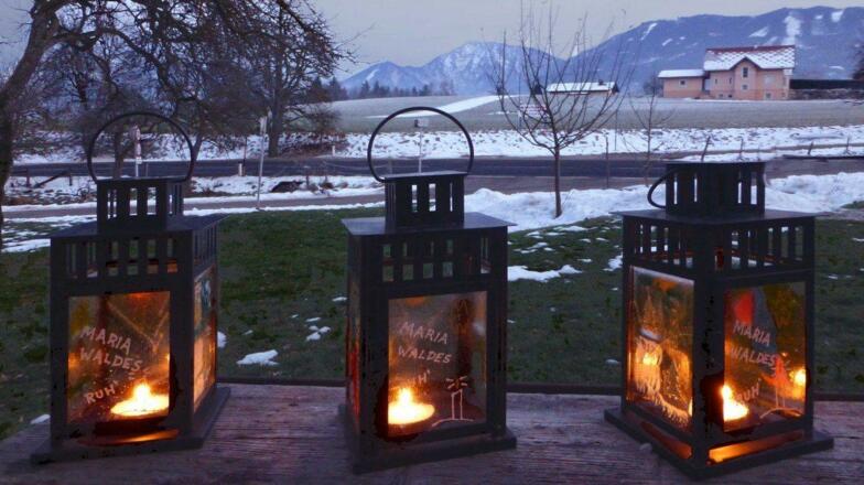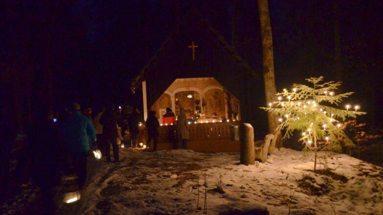 Bei klarem, kalten Winterhimmel machen wir uns gemeinsam mit unserem Pfarrer betend auf den Weg. Die Laternenwanderung führt von Tschachoritsch vorbei am „Scholi-Kreuz“ bis zur Kapelle Maria Waldesruh. Bei der mit Kerzenschein erleuchteten Kapelle wird eine Adventandacht gehalten.