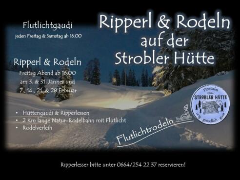 Zusätzlich findet am 03. und 31. Januar und 07., 14., 21. und 28. Februar das Ripperl & Rodeln auf der Strobler Hütte statt. Für Ripperlesser wird unter der Tel.: 0664/254 22 37 um Anmeldung gebeten.