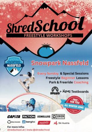 Die Shredschool ist ein Projekt, das es sich zur Aufgabe gemacht hat, motivierte Wintersportler aller Altersklassen für den Freestylesport im Funpark zu begeistern. Sowohl Anfänger als auch fortgeschrittene Freestyler werden individuell von Profis,wie Friedl Kolar und Steve Gruber betreut – vom ersten Minijump bis hin zur Contestvorbereitung.