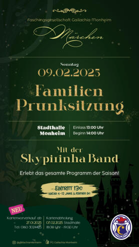 Familienprunksitzung der FG Gailachia Monheim in der Stadthalle Monheim.Mit der Skypirinha Band.Auftritte aller Garden des Vereins + abwechslungsreiche Gastauftritte, Barbetrieb im Foyer.Bewirtung durch FERBER Monheim.HEUER ERSTMALIG MIT KARTENVORVERKAUF ab 27.01.2025, Tel. 0160 3024425Kartenabholung im Foyer der Stadthalle Monheim für Prunksitzung und Familienprunksitzung: 07.02.2025 von 18:00 -19:00 Uhr