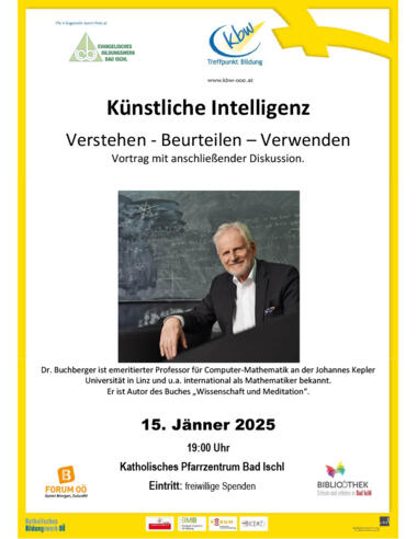 Am 15. Jänner um 19:00 Uhr findet im katholischen Pfarrzentrum Bad Ischl ein Vortrag mit anschließender Diskussion von Herrn Dr. Buchberger zum Thema "Künstliche Intelligenz -Verstehen - Beurteilen – Verwenden" statt.