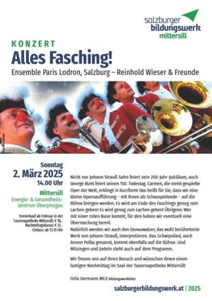 Nicht nur Johann Strauß Sohn feiert 200 Jahr Jubiläum, nein auch George Bizet feiert seinen 150. Todestag. Carmen! die meist gespielteste Oper der Welt erklingt in Kurzform– das heißt für Sie, dass wir eine kleine Opernaufführung – mit Ihnen als Schauspieler - aufführen werden. Aber hallo, wir haben uns schon noch mehrere lustige Sachen für das Ende des Faschings 2025 überlegt. So einfach kommen Sie uns nicht davon. Es gibt genug zum Lachen ! Sparen Sie sich das Lachen auf diesen Nachmittag auf ! Und übrigens, wer mit einer roten Nase kommt, für den haben wir eventuell eine Überraschung bereit. Natürlich werden wir auch den Donauwalzer, das wohlberühmteste Werk von Johann Strauß interpretieren. Tanzen ist natürlich erwünscht, sofern Platz genug vorhanden ist. Ebenfalls kommt das berühmte Schwipslied, auch Annen Polka genannt auf die Bühne. Mal sehen , was sich noch alles ergibt. Das letzte mal war das Konzert „Die Alpenrose aus Mittersill“ ein voller Erfolg. Nun zum Mitsingen und Jodeln werden wir an diesem Tag schon auch kommen. Wir freuen uns auf Ihren Besuch und wünschen Ihnen einen lustigen Nachmittag im Tauern-Apothekensaal Mittersill!