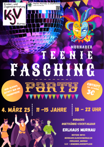 TEENIE FASCHING PARTYParty zum Faschingsdienstag für alle Teenies von 11-15 Jahren.Es gibt eine Getränke und (alkoholfreie) Cocktailbar, große Tanzfläche, Faschings- und Partymukke.3€ Eintritt inklusive Getränkegutschein.WICHTIG: Bitte einen Altersnachweis mitbringen!Veranstalter: Kinder- und Jugendvertretung Murnau und Gemeindejugendpflege